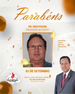 A mesa diretora da CIEADEP através do seu Presidente Pastor Perci Fontoura, parabeniza Pastor Edis Polini Presidente AD Castro, pela passagem de seu aniversário. Deus abençoe ricamente sua vida, família e ministério!