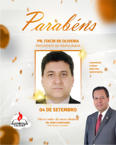 A mesa diretora da CIEADEP através do seu Presidente Pastor Perci Fontoura, parabeniza Pastor Itacir de Oliveira Presidente AD Itaipulândia, pela passagem de seu aniversário. Deus abençoe ricamente sua vida, família e ministério!