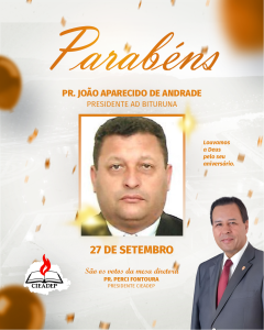 A mesa diretora da CIEADEP através do seu Presidente Pastor Perci Fontoura, parabeniza Pastor João Aparecido de Andrade Presidente AD , Bituruna, pela passagem de seu aniversário. Deus abençoe ricamente sua vida, família e ministério!