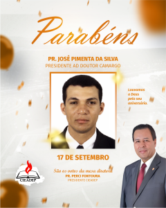 A mesa diretora da CIEADEP através do seu Presidente Pastor Perci Fontoura, parabeniza Pastor José Pimenta da Silva Presidente AD Doutor Camargo, pela passagem de seu aniversário. Deus abençoe ricamente sua vida, família e ministério!