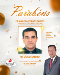 A mesa diretora da CIEADEP através do seu Presidente Pastor Perci Fontoura, parabeniza Pastor Juarez Alves dos Santos Presidente AD Maria Helena , pela passagem de seu aniversário. Deus abençoe ricamente sua vida, família e ministério!