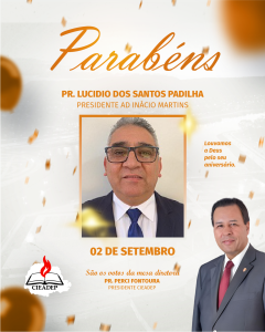 A mesa diretora da CIEADEP através do seu Presidente Pastor Perci Fontoura, parabeniza Pastor Lucidio dos Santos Padilha Presidente AD Inácio Martins, pela passagem de seu aniversário. Deus abençoe ricamente sua vida, família e ministério!