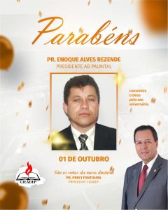 A mesa diretora da CIEADEP através do seu Presidente Pastor Perci Fontoura, parabeniza Pastor Enoque Alves Rezende Presidente AD Palmital, pela passagem de seu aniversário. Deus abençoe ricamente sua vida, família e ministério!