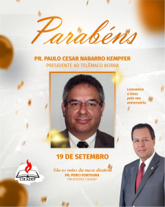 A mesa diretora da CIEADEP através do seu Presidente Pastor Perci Fontoura, parabeniza Pastor Paulo Cesar Nabarro Kempfer Presidente AD Telêmaco Borba, pela passagem de seu aniversário. Deus abençoe ricamente sua vida, família e ministério!