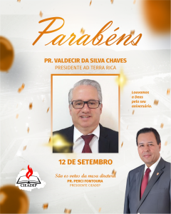 A mesa diretora da CIEADEP através do seu Presidente Pastor Perci Fontoura, parabeniza Pastor Valdecir da Silva Chaves Presidente da AD Terra Rica, pela passagem de seu aniversário. Deus abençoe ricamente sua vida, família e ministério!